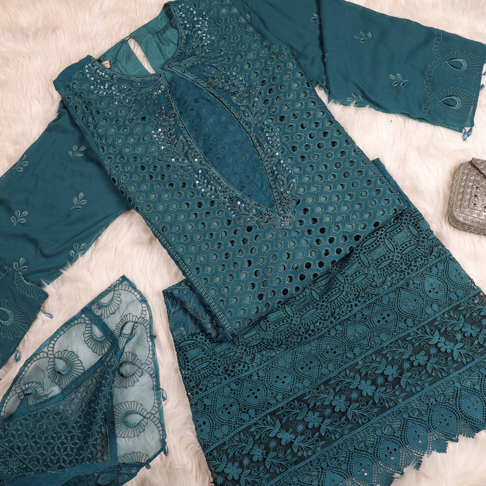 Elevate your ethnic wardrobe with this Emerald Green Pakistani suit, crafted from premium fabrics for a soft and comfortable fit. The rich emerald shade paired with intricate detailing creates a striking, elegant look.