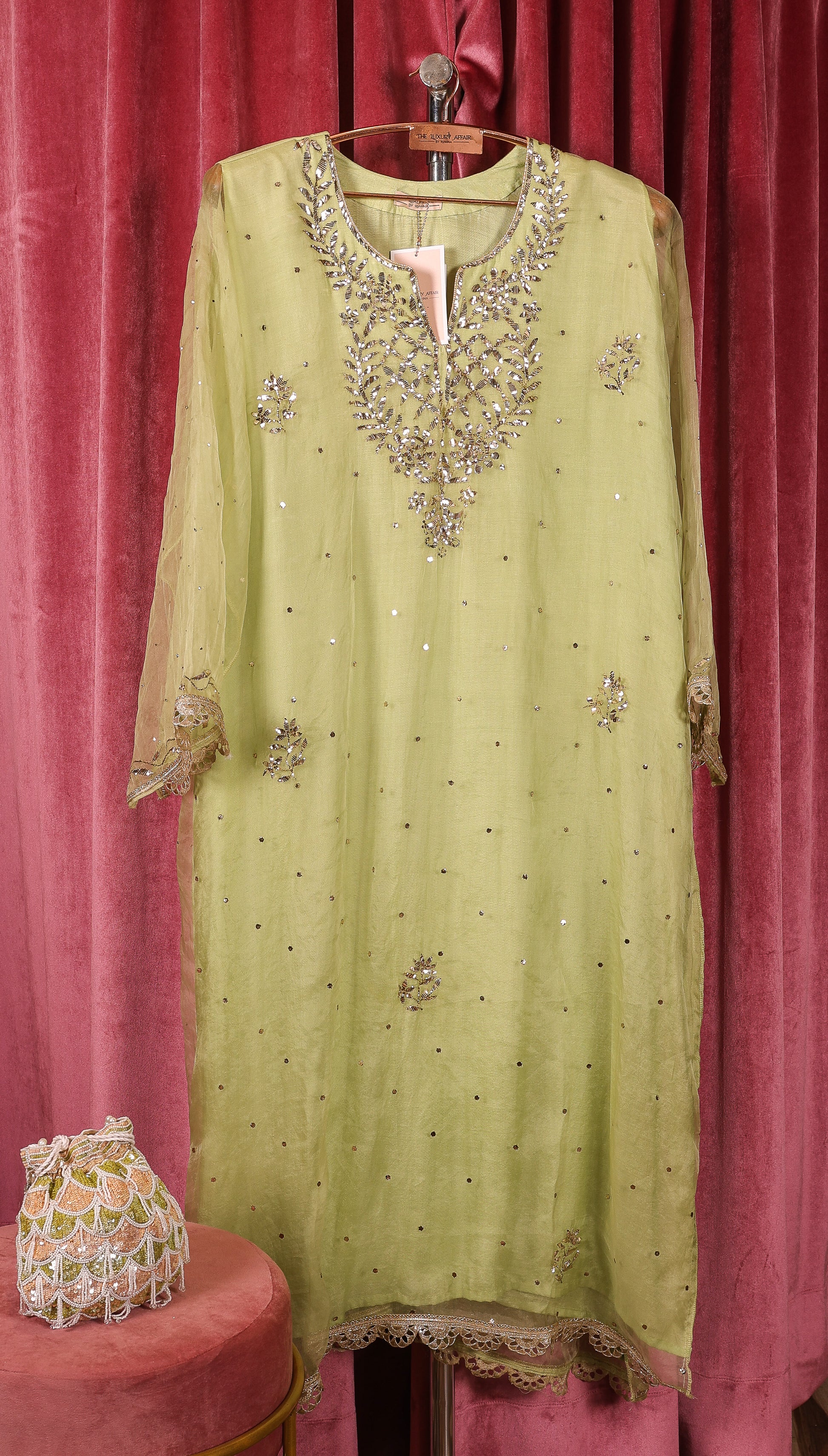 Vibrant and refreshing, this lime green organza suit is an expression of modern elegance. The fine pita work enhances its lively tone, creating a balance between subtle artistry and bold color. Its lightweight fabric ensures ease of wear, even during long festivities.
