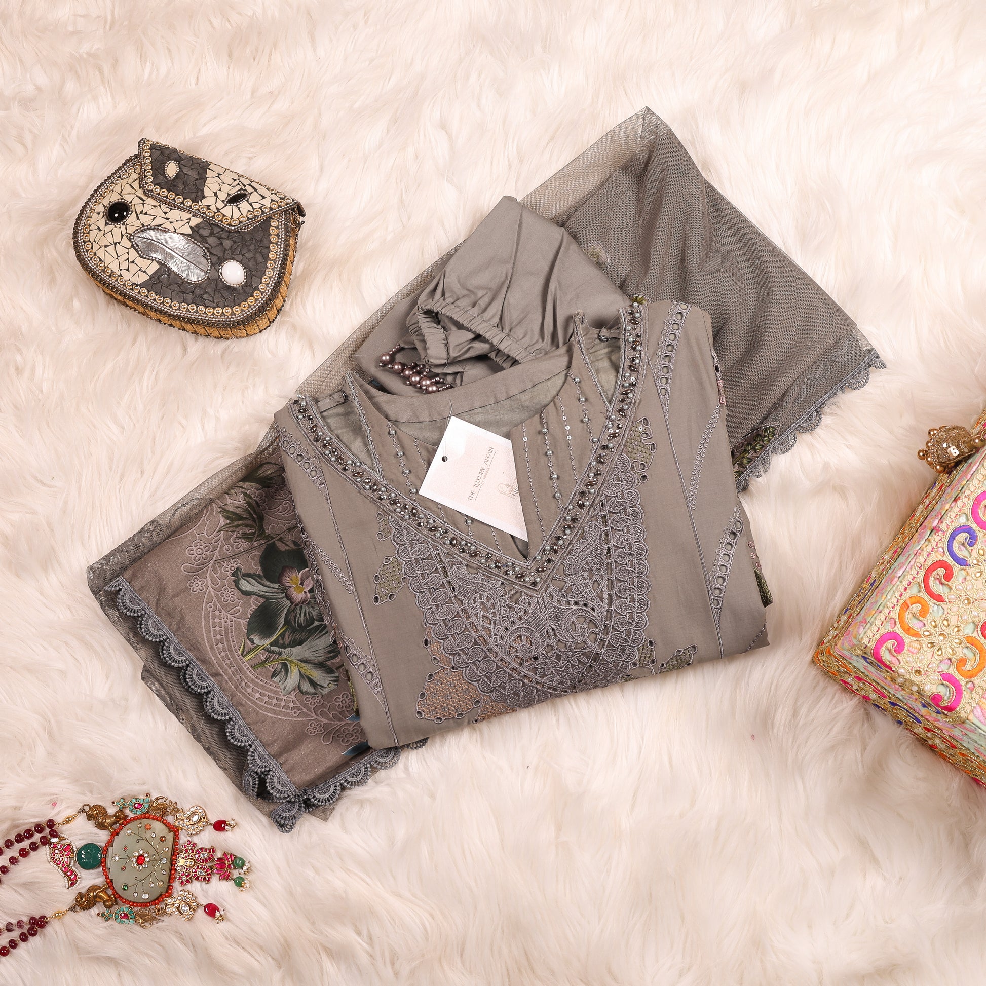 Elegantly crafted in soft grey tones, this stitched Pakistani suit blends timeless charm with effortless sophistication. Designed for ready wear, it saves you the hassle of tailoring while ensuring a flawless fit.