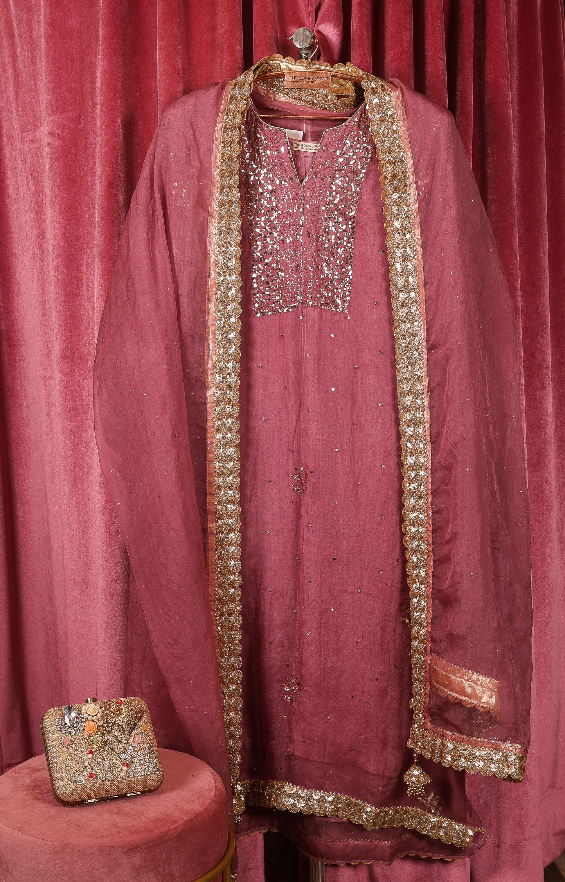Soft and radiant, this rose pink organza suit is delicately adorned with pita work embroidery. The lightweight fabric flows gracefully, giving a feminine silhouette that’s both flattering and comfortable. Its subtle shimmer adds sophistication without overpowering its charm.