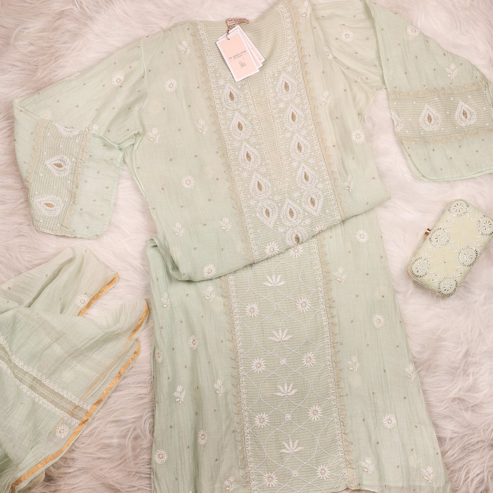 Crafted in soothing sea green mul fabric, this suit is adorned with intricate Chikankari embroidery that brings out its refined beauty. The soft texture of the fabric makes it graceful and comfortable for all-day wear.