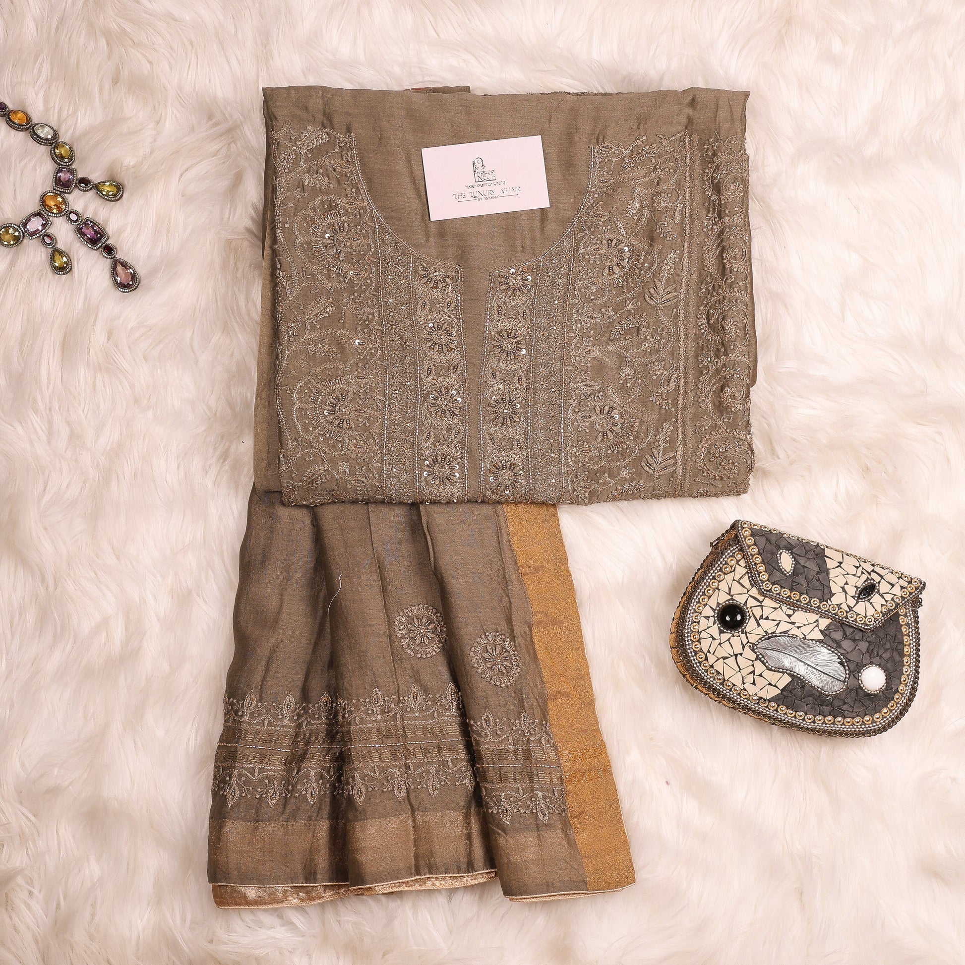 This elegant suit showcases the richness of silk blended with the timeless artistry of chikankari. The intricate hand embroidery enhances its regal charm, while the luxurious fabric ensures a graceful drape with lasting comfort.